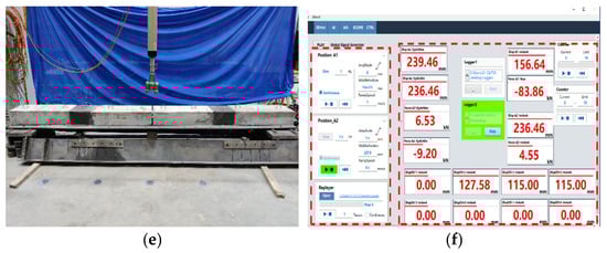 The SIControl (V2.0) software is designed to facilitate the real-time acquisition and storage of critical experimental parameters, including frequency, amplitude, and actuator reaction force. Furthermore, it is capable of plotting the actuator reaction force as a function of time, thereby rendering the test procedure tangible and observable. The loading setup and data acquisition of the software are shown in Figure 4f. The study of the reaction forces exerted on the actuator during vibration and the surface of the joint after vibration found that the reaction forces on the actuator at the UHPC joint during vibration showed no significant changes at the initial setting stage. From the initial to final setting, the maximum and minimum reaction forces increased linearly with time, and the load growth tended to level off at 16 h after concreting. Under the live load vibration of 3 Hz-5 mm, the UHPC joint developed cracks measuring 14 cm in length and 0.2 mm in width. The cracks in the joint specimens under live load vibrations occurred during the initial to final setting stages of the joint material casting.