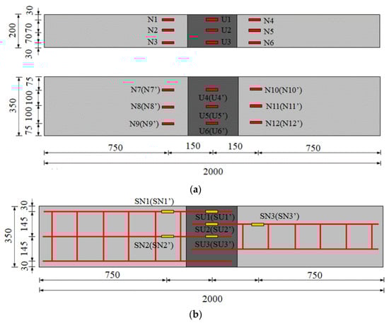 Strain measuring point arrangement. (a) Concrete measuring points. (b) Rebar measuring points.