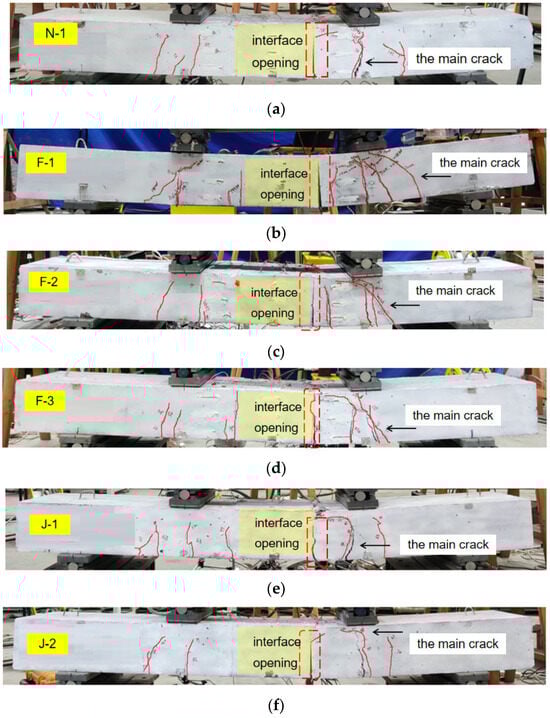 Failure model and crack pattern of the specimens. (a) Specimen N-1. (b) Specimen F-1. (c) Specimen F-2. (d) Specimen F-3. (e) Specimen J-1. (f) Specimen J-2.