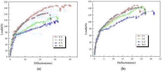 Table 4 summarizes the test results; the stands for the increase in ultimate load and the stands for the increase in peak displacement. To evaluate the impact of different vibration amplitudes, the load-deflection curves in the span during the test were plotted according to the test data. To facilitate the comparison, the average results for each group were selected for analysis in each group, as shown in Figure 10a. By analyzing Figure 10a, it can be found that the highest flexural strength of UHPC joint specimens under different vibration amplitudes is 3 Hz-1 mm (F-1), followed by 3 Hz-3 mm (F-2), and finally, 3 Hz-5 mm (F-3). The ultimate load of the F-1 specimen increased by 17% compared to the specimen that did not vibrate, while the ultimate load of the F-2 specimen decreased by 8% compared to the specimen that did not vibrate, and the ultimate load of the F-3 specimen decreased by 19% compared to the specimen that did not vibrate. This proves that low-amplitude live-load vibrations can be used to make the joints more compact. In addition, in order to improve the flexural strength of the joint specimens, the bond strength of the joint interface and the prefabricated segment can be increased. In contrast, high-amplitude live-load vibrations will destroy the bonding performance between the prefabricated segment and the joint interface, therefore reducing the flexural capacity of the joint specimen.