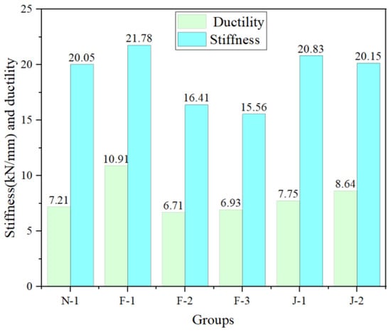 The ductility and stiffness of the specimens obtained from Equations (1) and (2) are tabulated in Table 5.