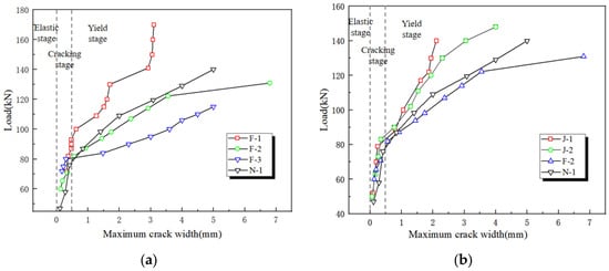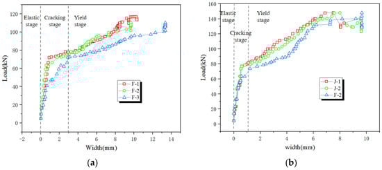 However, for J-2, F-2, and F-3 specimens, the load become larger at the greatest crack width. This is because during the loading process of UHPC joint specimens, the steel fibers within it can effectively hinder further propagation of cracks. Once the cracks reach a certain extent, the bridging action of the fibers or changes in the material’s microstructure may cause the cracks to cease expanding, but the specimen can still bear larger loads.