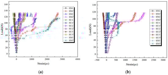 Figure 15 shows the load-concrete strain curves for the pouring-final setting vibration specimens. Figure 15a,b represents the load-concrete strain curves for the left and right precast sections, respectively. The compressive strain at the top of the right precast section is much greater than that at the top of the left precast section. The compressive strain at the top of the right precast section corresponding to the ultimate load has already exceeded the ultimate compressive strain, which matches the experimental phenomenon of the top crushing of the pure bending section of the right precast section when the joint specimen fails. The strain at the lateral measurement points of the precast section conforms to the plane assumption during the elastic stage of the specimen. The measurement points at the bottom of the precast section undergo tensile strain. As the concrete of the precast section reaches the ultimate tensile strain, the specimen cracks, and the strain gauges are subsequently damaged.