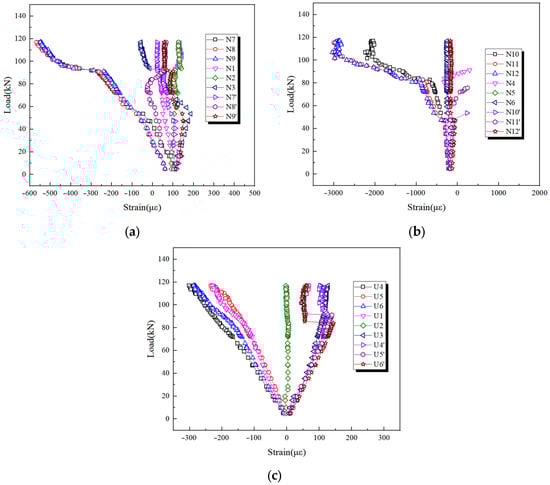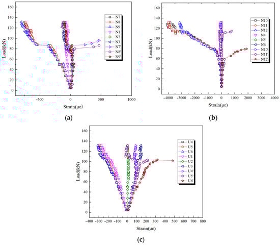 Figure 15c shows the load-concrete strain curve for the joint. Since the UHPC joint did not crack throughout the loading process, it can be seen that the strain of almost all measurement points increases linearly, and the lateral measurement points conform to the plane section assumption throughout the loading process.