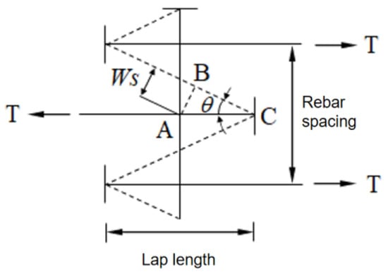 where is the tensile force of anchoring rebar tie rod; is the pressure of concrete compression rod; is the tensile strength of anchoring rebars and tie rods; is the tensile force of transverse rebar tie rod; is the angle between two opposite anchoring rebars at adjacent positions, ; l is the overlap length of two opposite anchoring rebars at adjacent positions; and s is the spacing between two adjacent anchoring rebars in the same direction.