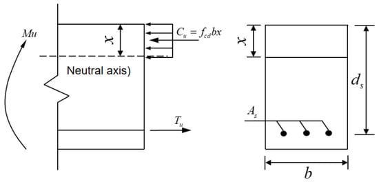 The position x of the neutral axis of concrete and the bending capacity of the joint can be obtained based on two equilibrium conditions: the sum of circuitous force in the horizontal direction on the section is equal to zero and the sum of moments at the point of resultant force in the compressed area is equal to zero. They are calculated according to Equations (12) and (13).