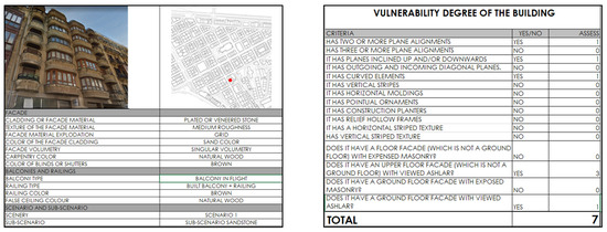 The identified characteristics facilitated the establishment of parameters to assess the vulnerability of buildings to facade interventions. These parameters are particularly linked to the compositional complexity of the facades. Interventions involving exterior ventilated facades were identified as posing a risk of excessive simplification of the facades and alterations to the overall landscape. For vulnerability assessment, various parameters were considered, including the number of alignments of different planes, the inclinations of the planes, the presence of recessed and protruding elements, and distinctive features such as curved elements, vertical or horizontal moldings, ornamental details, striped textures, and reliefs around openings, among others.
