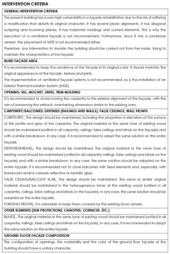 24]. Therefore, it is essential to establish applicable recommendations, based on scientific studies that support criteria for intervention in existing buildings [