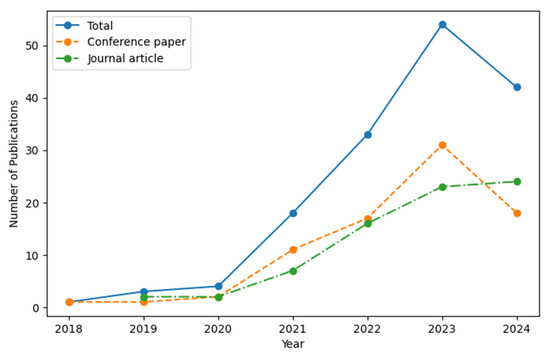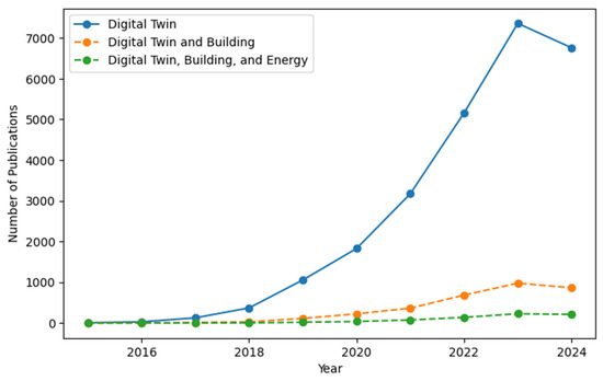An exhaustive search was conducted using specific keywords related to the adoption of digital twins in optimizing energy efficiency in buildings. The search query used was: (“Digital Twin” AND (“Energy Efficiency” OR “Energy” OR “Energy Management” OR “Energy System Optimization”) AND (“Buildings” OR “Smart Buildings” OR “Building Information Modeling” OR “BIM”)). Before 2018, digital twins were primarily adopted in sectors such as aerospace and manufacturing, while their application in the building sector remained scarce and largely exploratory [33,34]. This limitation was due to the lack of mature technologies, such as affordable IoT sensors, advanced artificial intelligence (AI) algorithms, and standardized building information modeling (BIM) tools, as well as challenges related to data fragmentation and high implementation costs [35,36].