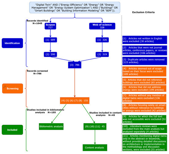 A total of 1045 articles were initially identified for this study. The selection process adhered to the PRISMA methodology, ensuring a rigorous and transparent approach. During the identification phase, duplicates and irrelevant articles were removed, reducing the total to 786 articles. A detailed review of the titles and abstracts of the remaining articles was then conducted, excluding studies that did not meet the inclusion criteria—specifically, those unrelated to digital twins or outside the building context, as outlined in Table 2. At the end of this phase, 155 articles were selected for bibliometric analysis. This stage focused on the metadata of the articles, regardless of full-text accessibility. During the inclusion phase, which required a full-text review of the articles, 51 articles were excluded due to lack of access to their full text. The remaining articles were then thoroughly analyzed to ensure their relevance and alignment with the study objectives. This rigorous process led to the exclusion of certain articles that did not meet the defined criteria. First, four literature reviews, while interesting and relevant, were analyzed separately and therefore excluded from the main analysis. Additionally, 55 articles that mentioned digital twins only in the abstract or keywords, without providing technical details on architecture or implementation within the methodology and discussion sections, were also removed. Following this phase, only the most relevant and detailed studies were retained, forming a robust foundation for the content analysis.
