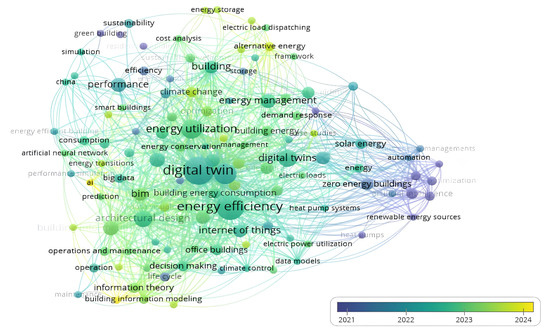 Figure 5, generated using VOSviewer, illustrates the thematic relationships and the evolution of priorities in research on digital twins applied to building energy efficiency. “Digital twin” occupies a central position, reflecting its key role, and is closely linked to fundamental concepts such as “energy efficiency”, “building energy consumption”, and “performance”, which represent initial priorities in energy management. Over time, emerging themes, such as “renewable energy”, “energy storage”, “electric load dispatching”, and “zero energy buildings”, have gained prominence, highlighting a shift toward sustainable and decarbonized solutions. At the same time, the integration of advanced technologies such as artificial intelligence, the Internet of Things, BIM modeling, big data, prediction, and real-time control plays a crucial role in automating and connecting building energy systems. This visualization also highlights opportunities for future research, particularly the interconnection of emerging technologies with sustainable solutions to create intelligent and autonomous buildings. Finally, the clusters identified in this figure provide a critical framework for structuring an in-depth content analysis, exploring the practical applications of these concepts, the technologies that support them, and the challenges to overcome in complex energy environments.