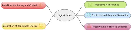 Digital twins serve a key function in real-time monitoring and control of building energy systems by leveraging data collected through IoT sensors to optimize HVAC systems, lighting, and other critical equipment. For HVAC system optimization, ref. [60] focuses on real-time monitoring and control of energy consumption and HVAC performance in non-residential buildings using IoT sensors, enabling proactive management of energy retrofits. Similarly, ref. [61] applies a real-time monitoring approach in a hospital in China, optimizing HVAC systems, lighting, and medical equipment while maximizing occupant comfort.