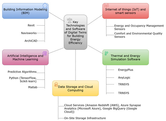 Despite significant advancements in passive energy management approaches, these methods are increasingly constrained by the complexity of modern infrastructure [7]. Often static in nature, they struggle to meet the dynamic, real-time demands of contemporary buildings [8]. To address these challenges, intelligent solutions capable of anticipating, optimizing, and actively controlling energy consumption have become essential [9]. Heating, ventilation, and air conditioning (HVAC) systems, which represent a large share of a building’s energy consumption, exemplify this need [10,11]. Similarly, optimizing the management of lighting systems and other energy-intensive infrastructures remains a significant challenge, especially in large and complex facilities [12,13,14]. Emerging technologies, particularly digital twins, offer a transformative approach to overcoming these challenges [15]. A digital twin creates a precise virtual model of a physical structure [16], integrating static data from building information modeling (BIM), which provides a structured and detailed foundation for a building’s geometry, materials, and systems [17,18], with dynamic data collected in real time via Internet of Things (IoT) sensors that monitor parameters such as temperature, energy consumption, and occupancy patterns [19]. By leveraging artificial intelligence algorithms, digital twins enable the simulation, analysis, and prediction of a building’s energy performance, providing in-depth insights into energy flows and potential sources of inefficiency [20,21]. These capabilities pave the way for data-driven decision-making and energy optimization strategies that rely on real-time insights [22].