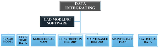 As shown in Figure 4, in the data integrating process and basic information, such as the maintenance plan and history (detection records), are typically displayed in conventional forms or tables. These tables organize essential data, such as real-time data, providing a structured view (construction history) that users can quickly interpret. Furthermore, conventional methods often use 4D CAD drawings models to visualize any geometrical maps, making it easier for users to understand spatial relationships and design layouts. Statistical data are frequently provided in PDF format, ensuring that important figures and trends are preserved in a standardized and shareable form. This method organizes and presents diverse data types for quick reference and analysis.