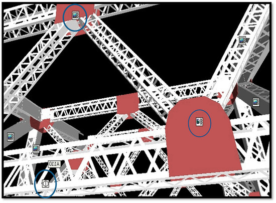 The 4D Bridge model components had the appropriate data immediately attached to them inside the circles, as shown in Figure 7. After identifying the model and verifying the maintenance data, the research authors connected them to the bridge model component. The 4D Bridge model was used to investigate the bridge management system.