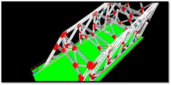 The bridge model defects were detected, their properties were determined, and the condition of their materials were checked in the CAD modeling software with linking of the attached digital realistic photo of the defect, as shown in Figure 14. The deterioration defect was defined as shown in Figure 15, as material deterioration in the truss angel with a yellow color in the detection mode. Clashes were detected in the truss I-beam by the green color in the 4D Bridge model, as shown in Figure 16.