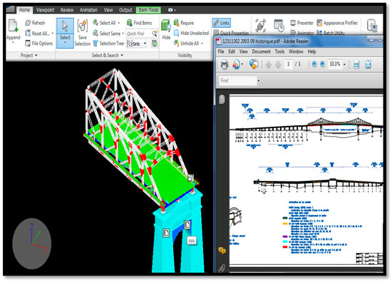 As mentioned above, all previous data were integrated together with the time into a 4D model of the bridge. In order to achieve this, adopting a clear method plan as indicated in Figure 3, was very necessary due to the complicated relationship between manual, schedule, and digital data. At this point, incorporating all available data, such as maintenance reports, related time events, and detailed drawings, into the 4D CAD model was the major priority of this work. The application of this practice will certainly help in ensuring compatibility among all inspectors who are interesting in direct accessing of the project’s data. Figure 3 clarifies the methodological steps followed in the study. Additional information, discussions, and results regarding the approach are provided in the ensuing sections.