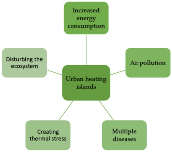 Research conducted in the United States indicates that road pavements constitute 20–40 percent of a city’s composition, while buildings account for 9–25 percent [,,]. Consequently, approximately 75% of a city’s surface is covered by materials such as asphalt–concrete blends and bituminous coatings on rooftops [,,]. These surfaces, characterized by their unique textures and darker hues compared to natural vegetation and soil, effectively store heat through radiation [,]. Furthermore, the interplay between weather conditions, geographical features, and seasonal variations within a particular city significantly exacerbates this detrimental phenomenon [,]. The detrimental effects of UHIs manifest gradually and can be classified into two distinct categories: adverse effects on the environment and detrimental consequences for human health. These negative outcomes include global warming and the proliferation of various diseases, notably heart and skin disorders. Disturbingly, data from the Centers for Disease Control and Prevention reveal a stark reality: between 1979 and 1998, a staggering 7421 deaths in the United States were attributed to excessive heat [,]. According to Figure 2, some of the negative consequences of the UHI phenomenon include increased human demand for cooling, higher energy consumption, increased pollution, decreased air quality, heightened heat stress on urban residents, an elevated risk of heat-related diseases, and amplified global warming and abnormal ecosystem changes [,,,,].