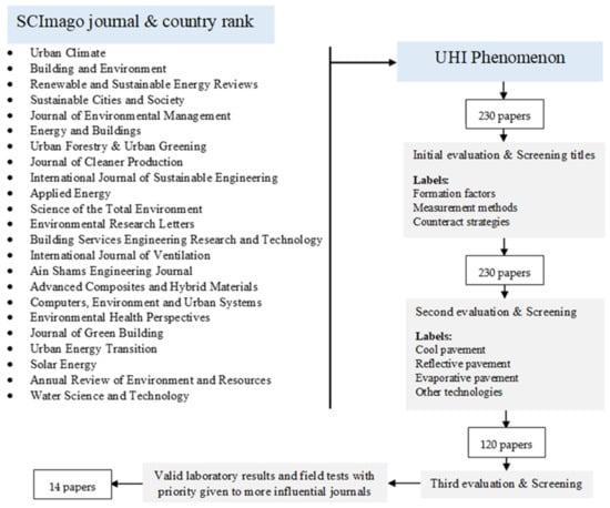 This study delved into the impact of the surface and functional attributes of road pavements on mitigating the UHI phenomenon. It involved the meticulous evaluation of over 400 credible scientific articles. The selection of studies was guided by clearly defined inclusion and exclusion criteria. The inclusion criteria prioritized studies published in peer-reviewed journals, articles focused on UHI mitigation strategies, and research specifically addressing the role of road pavements, including various types of cool pavements. The exclusion criteria eliminated studies that lacked empirical data, were not published in English, or were deemed outdated or irrelevant to the scope of this research. The articles were sourced from reputable scientific databases, including Scopus, Web of Science, and Google Scholar, using keywords such as “urban heat island”, “road pavements”, “cool pavements”, and “UHI mitigation”. The selection and review processes are illustrated in Figure 3. This comprehensive analysis encompassed methods for measuring UHIs, the role of road pavements, and their influence on this phenomenon. The findings of this research serve as a valuable reference to advance our understanding of UHIs and strategies for their mitigation.