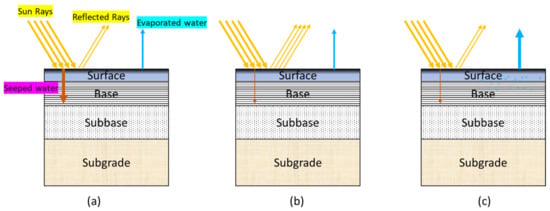 Types of cool pavements: structures of typical (a) conventional pavement, (b) reflective pavement, and (c) permeable pavement (pervious concrete or pavers, with infiltration shown in light blue) [].