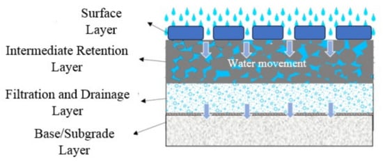 These pavements promote heat reduction through water retention and evaporation. They feature materials or designs that facilitate water infiltration, which absorbs heat and lowers temperatures through evaporation []. This observation has led to the development of evaporative pavements, which employ various strategies to direct and store water within their layers. As the air temperature rises, the stored water gradually evaporates, effectively lowering the pavement surface temperature through the latent heat of evaporation. This process is often initiated by rainfall [,,,]. Additionally, evaporative pavements enhance environmental sustainability by allowing excess water to infiltrate into the underlying soil and groundwater table, thus reducing surface temperatures [].