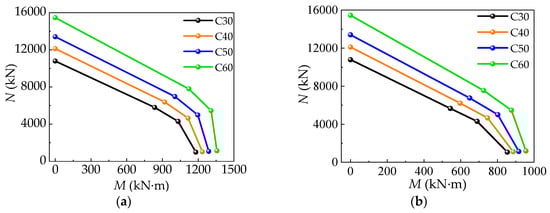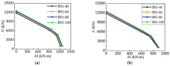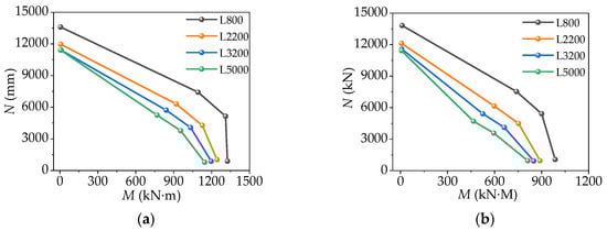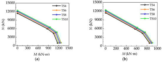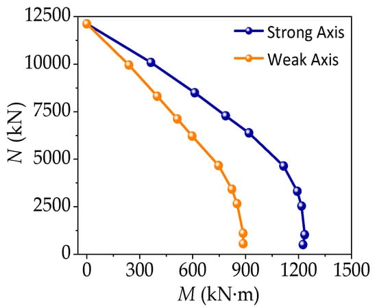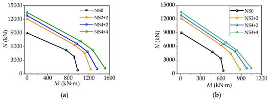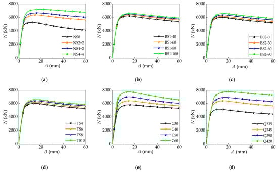 - The effects of L, ns, bs1, bs2, ts, fcu, and fy on the eccentrically loaded capacity of web-perforated T-shaped stiffened RCFST columns were analyzed. An increase in L reduces the overall stability of the member, making its mechanical behavior closer to that of a pure steel column. Enhancing fcu and fy improves the load-bearing capacity; however, increasing fcu reduces the ductility and deformability of the columns. The number of stiffeners has a more significant influence on the bearing capacity of members under strong-axis eccentric loading, with a smaller impact on the weak axis. Among the stiffener size parameters, bs2 and ts exhibit a more significant influence on the load-bearing capacity compared to bs1.