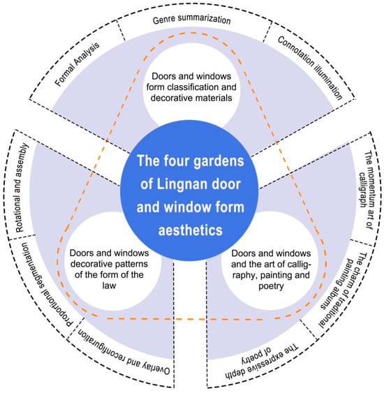 The architectural styles of doors and windows in Lingnan gardens exemplify both humanistic values and social adaptability, with their decorative elements particularly highlighting these characteristics. Xue [10] classified Lingnan doors and windows according to their primary structural components, thereby organizing the evolutionary factors influencing the decorative arts associated with traditional Lingnan architecture. This classification provides a temporal framework for understanding the transformation of the underlying cultural phenomena. Zhu [11] examined the decorative craftsmanship within Lingnan garden architecture, focusing on the physical attributes of door and window decorations and their intrinsic semantic meanings. Liang [12] identified that Lingnan garden decorations reflect the essence of materials and expressionism, shaped by the dual influences of indigenous and Western cultures. By examining the decorative themes present in doors and windows, Yang [13] highlighted the emphasis on practical utility in the local culture. Concurrently, research from an artistic perspective has advanced, with Zhang [14] investigating the color schemes of window decorations from a chromatic standpoint, concluding that the predominant color palette in Lingnan gardens is characterized by “dark colors as primary, with bright colors as complementary”. Chen [15] analyzed the spatial construction logic of Lingnan gardens through the lens of landscape painting, primarily addressing the relationship between garden space and theoretical techniques in painting, while also indirectly affirming the connection between garden doors and windows and traditional painting arts. Feng [16] summarized the laws of decorative patterns for windows and doors on an aesthetic level, contributing to the exploration of compositional forms. While the aforementioned studies have examined the art of garden doors and windows from various perspectives, including historical evolution, linguistic symbolism, and thematic color analysis, there remains a notable deficiency in the exploration of their aesthetic connotations.