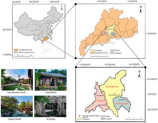 The Pearl River Delta region, situated in central Guangdong Province, serves as the political, economic, and cultural nucleus of the Lingnan area (Figure 2), and experienced a flourishing of garden construction during the Ming and Qing dynasties. The rationale behind choosing the four classic Lingnan gardens of Yuyin Garden, Qing Hui Garden, Liang Garden, and Ke Garden, our case studies, is as follows. Firstly, the four traditional gardens were built in the Ming and Qing dynasties, have a history of more than a hundred years, and are listed as national key cultural relic protection units. The diverse formal types and the rich array of decorative themes exhibited in the doors and windows within these gardens demonstrate a high level of artistic achievement, thereby lending them a typicality suitable for scholarly investigation. Secondly, the components and carvings of doors and windows within these four gardens are exceptionally well preserved, accurately reflecting the intended design characteristics. This provides our research with invaluable primary data, enabling a more precise understanding of the stylistic features of Lingnan garden doors and windows. Thirdly, a wealth of historical documentation concerning these four gardens exists, along with a foundational body of research into their door and window craftsmanship. This prior scholarship allows us to build upon established knowledge and delve more deeply into the artistic and cultural significance of their formal designs.