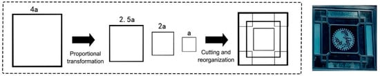 Proportional segmentation refers to the process of dividing unit patterns into new units of varying dimensions according to specific proportions, followed by the recombination of these units to form divisions of differing sizes within the overall composition. An illustrative example of this concept can be observed in the Manchu windows of Yuyin Garden, which are constructed from squares of various proportions. These squares create innovative patterns that exhibit a harmonious rhythm within the two-dimensional space (Figure 12).