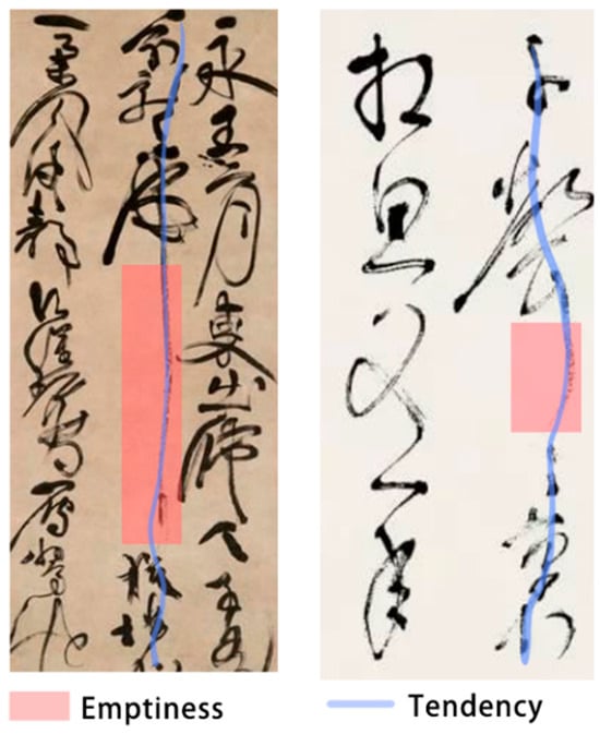 Calligraphic composition is characterized by an emphasis on the spatial intervals between phrases and characters, specifically incorporating pauses, known as “emptiness”. However, these interruptions do not disrupt the continuity of the strokes, but maintain a coherent sense of movement (Figure 16). Judicious pauses contribute to a balanced composition, where both density and openness are achieved while sustaining the overall vital rhythm. As noted, “The connection does not lie in the meeting of lines, but in the connection of qi (similar to air). Qi connection refers to the connection where the lines do not meet [30]”.