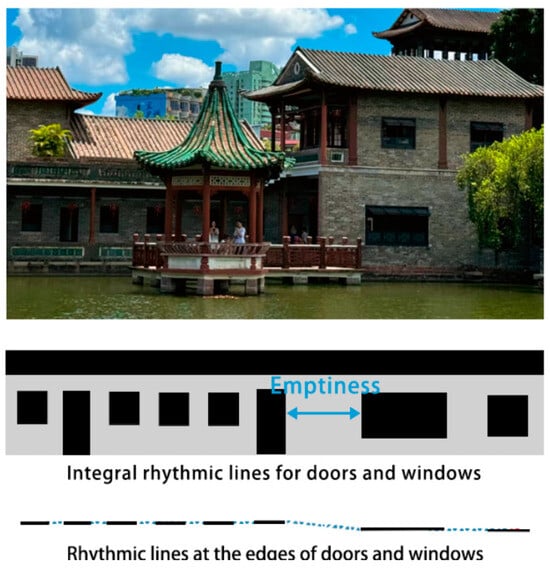 An illustrative example can be found in the facade of Ketable Wall in Dongguan Ke Garden, which features a systematic arrangement of multiple windows and doors that creates an orderly sequence. However, the unequal spacing between windows on the right-side facade generates “emptiness”, thus creating a rhythmic pause; The varying lengths and sizes of the doors and windows produce a coherent rhythm, similar to calligraphy, where unity and variation are achieved through a carefully balanced, staggered arrangement (Figure 17).
