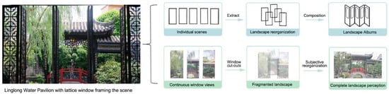 Albums represent a distinctive mode of presentation in Chinese painting, characterized by the segmentation of subject matter into discrete scenes, with each page illustrating a singular vista. The act of sequentially flipping through these pages engenders a scroll-like effect, enabling the viewer to mentally reconstruct the individual scenes into a cohesive image. Linglong Water Pavilion, located within Yuyin Garden in Guangzhou, is an octagonal structure that features a full-length lattice window on its facade. When observing the view through this window, the lattice grilles fragment the external scenery into a series of paneled images [32], reminiscent of the small scenic units typically found in Chinese landscape album pages. As viewers engage dynamically with the environment, the segmented scenery is synthesized into a unified image within their cognitive framework. This artistic approach parallels the creative process involved in the production of landscape album pages, thereby enriching the viewing experience with additional layers of interest (Figure 18). A poem reads, “A zither rests upon the table, idly; outside the window, a few bamboos show their green. No one is present behind the quiet curtains and blinds, as the spring breeze blows in by itself” [33], depicting the scenery and the functional roles of doors and windows. The inherent beauty of the garden, framed by these architectural elements, undergoes a process of transformation and reconstruction within the viewer’s mind through visual engagement, ultimately contributing to a comprehensive experience of the garden’s landscape.