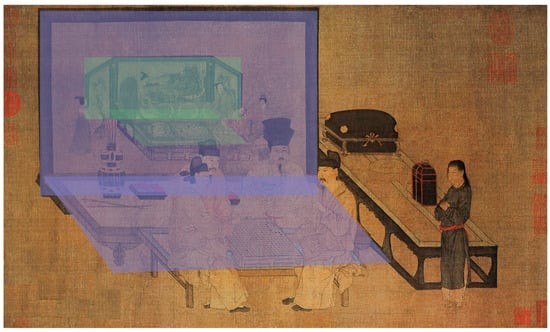 The use of the double screen as a painting method in traditional Chinese painting exhibits parallels with the framing of views found in garden door and window designs. In traditional Chinese painting, the use of double screens as a painting technique shares commonalities with the scenic arrangements found in garden doors and windows. As the American art historian Wu Hung has noted in his analysis of a double-screen painting of a gathering and chess playing, the artwork employs double screens or a similar overlapping composition. By adding “internal frames” parallel to the picture plane, the artist achieves a trompe-l’œil effect and a feeling of depth in space [34]. The painting employs two screens, arranged from larger to smaller and from outer to inner, to depict a spatial recession with layered depth (Figure 19).