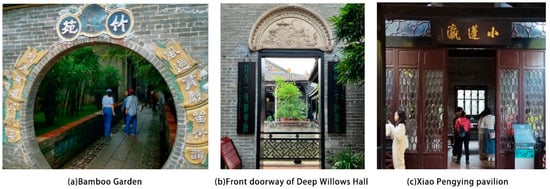 Some of the Lingnan gardens are embellished with couplets and plaques around the windows and doors. These items contain summaries and interpretations of the scenery’s meanings, which enhance the viewer’s comprehension of the attractions’ meanings while also serving as a distinctive kind of art with the landscape’s doors and windows and the interface’s structure. In “Dream of the Red Chamber”, it is articulated, “Such grandeur of scenery, so many pavilions, all flowers, willows, mountains, and waters, without inscriptions, would fail to add to their charm” [35]. This statement underscores the essential function of couplets and plaques in augmenting the aesthetic appeal of garden landscapes.