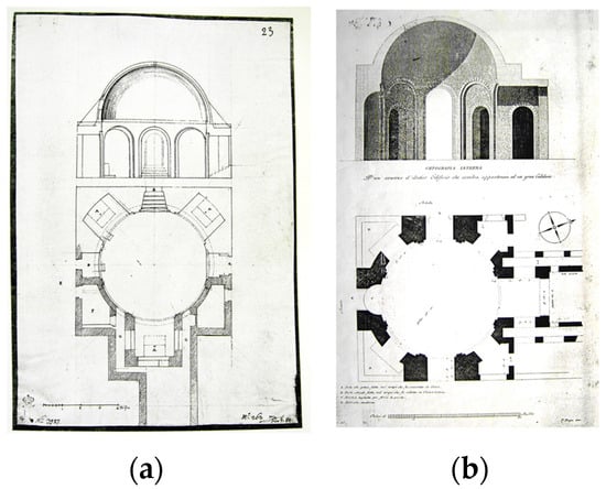Plan and section of the Rotonda by: (a) J. Houel (J. Houel, Antiche terme trasformate in chiesa, 1776–1779, San Pietroburgo, Museo Statale dell’Ermitage) []; (b) S. Ittar (S. Ittar, Ortografia interna d’un avanzo d’ Antico Edificio che sembra appartenere ad un gran Calidario, Raccolta Degli Antichi Edifici di Catania Rilevati e Disegnati da Sebastiano Ittar, 1812, Catania) [].