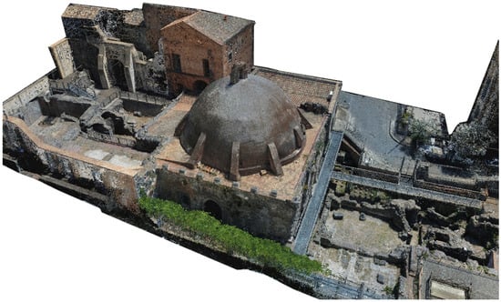 The Rotonda has sparked great interest and attractiveness from ancient times. Local historians first mentioned it in the 16th century, when it was considered the oldest Christian building in Catania, resulting from an older pagan temple. Since that time, knowledge about it was provided by L. Bolano, O. D’Arcangelo, and P. Carrera [], who identified it as the Pantheon of Catania. The greatness given to the building is demonstrated by the several iconographies of the city of Catania, which date from the 16th to 18th centuries, where the Rotonda is depicted with a circular layout and is emphasised compared to the urban context.