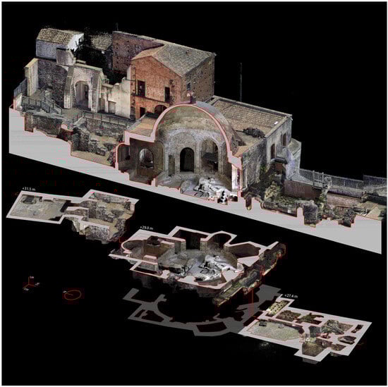 The origin of the Rotonda was revisited only from the middle of the 20th century, when different excavation campaigns were carried out to deeply investigate the building. The current archaeological area (Figure 3) is primarily the result of three successive excavation campaigns. The first one started in the years following the Second World War, as part of a broader restoration plan for the Rotonda to address the damage it sustained during the war. At that time, the Rotonda was the only visible structure in the area. This excavation campaign was led by G. Libertini and enabled to reveal Roman structures at the lower level of the Rotonda, under the floor existing at that time []. According to the identified floor levels, Libertini suggested distinct construction phases for the building, which included: (i) a Hellenistic-Roman phase; (ii) alterations from the imperial and late Roman times; (iii) a Byzantine phase; (iv) alterations from mediaeval time; and (v) a more recent phase dating to the 17th or 18th century. He concluded that the Rotonda was originally a caldarium from the Roman imperial period, which was later converted into a Byzantine church in the sixth century. In particular, the main building alterations involved: (i) raising the height of the original Roman floor level; (ii) converting the larger room into a presbytery; (iii) using some of the original Roman rooms as chapels. The first campaign also involved portions of the external southern area of the Rotonda, but no results were reported.