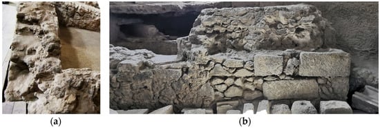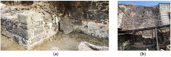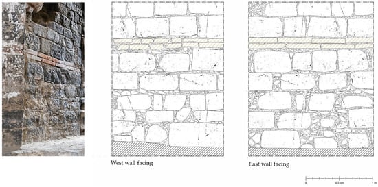 Larger and more regular-shaped stone blocks are in the most stressed sides of the walls of rooms 5–7, including buttresses, wall intersections, and the jambs of the original door opening in the south wall of room 6. Moreover, a brick course covers their entire thickness, except in a portion of wall in room 7 (Figure 8a), which is thus assumed to date back to a different construction phase. Overall, brick courses were typically used by Romans to increase the bond between wall facings and the middle core, control the wall levelness, and distribute loads more effectively []. Specifically, the brick course in the examined walls is made of bricks having a thickness of 7 cm and a length ranging between 20 and 60 cm. This brick course is in line in all the walls, except in the north wall of room 7, likely indicating that this wall was not built concurrently with the near ones. This wall is also incorporated in the south front of the Rotonda, where the corner stone blocks and a further brick course are visible (Figure 8b).