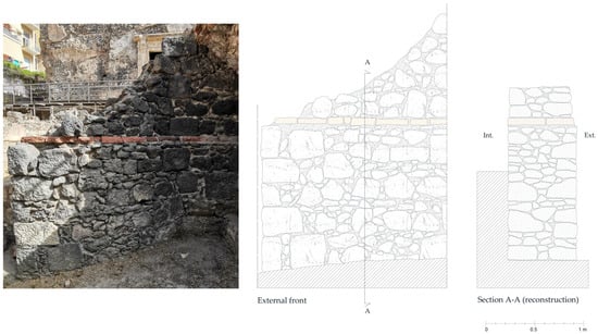 Masonries mainly made of irregularly shaped basalt stones also characterise both the outer and inner façades of the Rotonda. In particular, the outer façade is very uneven since it has different block sizes with many bricks and tile fragments in some wall portions, which indicate several alterations over the centuries. Evidence of many alterations are also detected in the inner façade of the Rotonda. Here, many traces of render do not give clear evidence of the masonry fabric. The most visible wall facings are those that delimit corridors i and l. Reconstruction evidence are in these walls, while the original wall portions are characterised by irregularly shaped basalt stones combined with roughly squared basalt blocks, several stone patching, and two brick courses (Figure 9). This masonry technique is typical in the Roman architecture of Catania dating to early and middle Roman imperial times [].