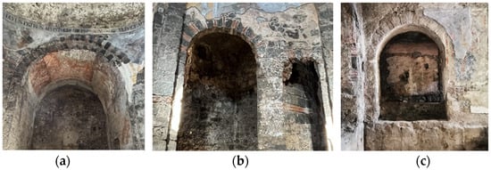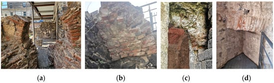 Two main arch construction techniques were detected in the archaeological site, which are brick arches and arches made of basalt voussoirs alternating with bricks (opus vittatum). The first ones are located both outside and inside the Rotonda. In particular, outside the Rotonda, the remains of two brick stokehole arches are in the northeast (Figure 10a) and south sides of room 7, where originally there were two furnaces that produced heat by fuel combustion. The arches have spans of 1.00 m and 0.60 m, respectively. The most intact stokehole arch is made of not tapered bricks (6–7 cm thick, 30–35 cm wide, variable length) laid with lime mortar (1 cm thick at the intrados, up to 4.5 cm thick at the extrados). The same technique is observed in the remains of two arches near the external facing of the south wall of room 6 (Figure 10b). Both are made of bricks (7–9 cm thick, variable length and width) on lime mortar beds having up to 3.5 cm thickness. The original role and geometry of these arches are not certain, but they seem to delimit portions of vaults. On the other hand, inside the Rotonda, remains of brick arches are detected in the gate to access corridor i (Figure 10c), behind the current arch in opus vittatum, and in the original crosswise access gate in niche e (Figure 10d). Traces of a probable brick arch are also set in the opposite wall of the crosswise gate in niche e. Then, intact brick arches are in two small niches that are located in rooms d and f.