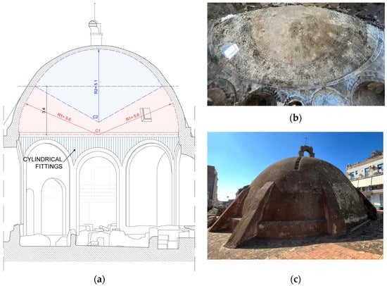 The Rotonda’s dome is also externally equipped with ten buttresses (Figure 12c). These buttresses have a polygonal shape and are made of basalt stones. At present, it is unknown whether they were built at the time of the original dome or later. Indeed, buttressing solutions were traditionally used in Roman domed buildings to contrast horizontal thrusts from the dome. For this purpose, Romans especially used to realise large, stepped abutments around the dome extrados to increase vertical thrusts compared to horizontal ones, as in the Serapeo of Villa Adriana at Tivoli and the Pantheon in Rome []. Buttresses with geometry similar to that of the Rotonda are in the Tempio di Mercurio at Baia, which has been identified as a laconicum from the first century B.C. [], but also in the Trigòna of Cittadella in Vendicari, which is a Byzantine cella with a trefoil plan dating between the VI and VIII centuries [].