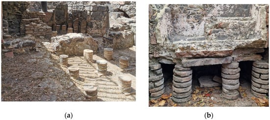 Remains of seven Roman thermal rooms (rooms 4–10) were brought to light in the external southern area, in front of the Rotonda. Among them, three adjacent rooms (rooms 5–7) have a rectangular plan and are orientated along the north-south direction. The west and south perimeter walls of room 5 are not visible, while in room 7, the east one is not visible. This is evidence of the wider extension of that rooms compared to the current archaeological area. The original wall elevations of these rooms are not preserved; thereby, it is not possible to define the original location of windows and doorways. Elements of the traditional Roman hypocaust system were found in rooms 6 and 7, as analysed more in detail in Section 5.3. Evidence of various changes in the building elements also proves different construction phases of these rooms and thereby probably their different uses over the centuries. The main evidences are: (i) remains of a stair in the north side of room 5, which interrupts probable original seats [], as well as the perimetral portion of the ancient room’s floor; (ii) the occlusion of an original access gate up to the current floor level in the south side of room 6; and (iii) two transversal walls in room 7 that are not bonded with the near west wall.