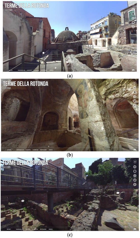 Views of the archaeological site in the virtual fruition platform: (a) external north area; (b) Rotonda inside; (c) external south area.