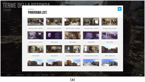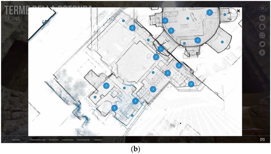 In the virtual reality environment formed by the succession of panoramic images, a series of hotspots was inserted to allow the transition from one panorama to the next, simulating a walk through the internal and external spaces of the site and, at the same time, linking information sheets on the research activities/results at some notable points in it. It is also possible to navigate within the tour using a list of available overviews or by selecting the hotspot directly from the map (Figure 15).