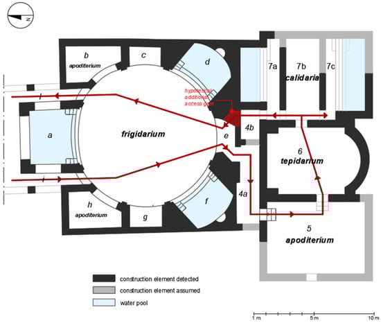 Based on the above, new hypotheses on the potential spatial relationship between the Rotonda and southern rooms are advanced. These assumptions are mainly based on the construction elements detected in room 4. Here, remains of two wall portions placed orthogonally to the south façade of the Rotonda would lead to the assumption of the original partition of this room in two smaller spaces (rooms 4a and 4b in Figure 17). The internal partition of room 4 could reflect an original layout of the Rotonda baths, which allowed the bather to make a “circular” thermal path from the cold room to hot ones without crossing the same rooms twice (Figure 17). Accordingly, the bather could access the frigidarium from the north side, through one or both of the corridors i and l. The southwest gate into the niche e allowed him to move to the heated rooms sector, which could be explored linearly from room 5 to rooms 7a–c. These rooms thus could have been used as apoditerium, tepidarium, and calidaria, respectively, as suggested also in previous studies [].