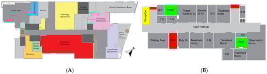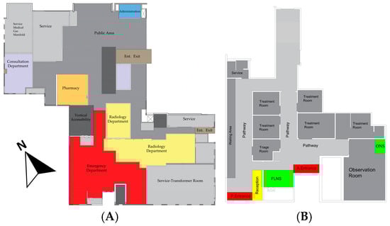 (A) Architectural plan for the ground floor of the case study “B”. (B) Zoning plan for the ER of the case study “B”.