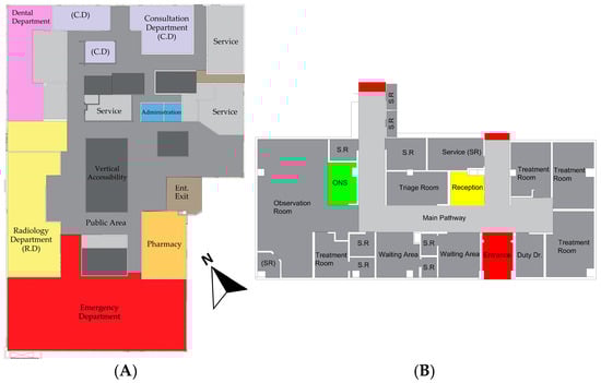 (A) Architectural plan for the ground floor of the case study “C”. (B) Zoning plan for the ER of the case study “C”.
