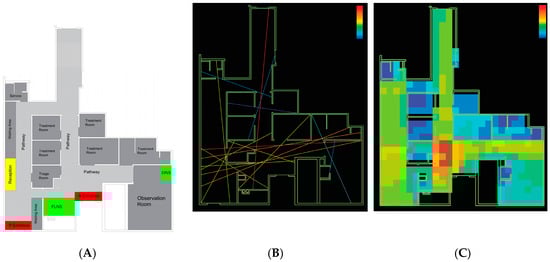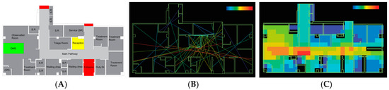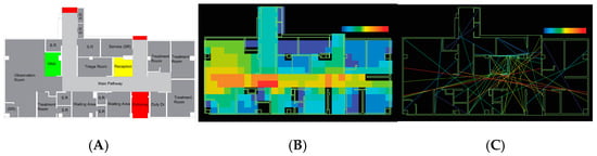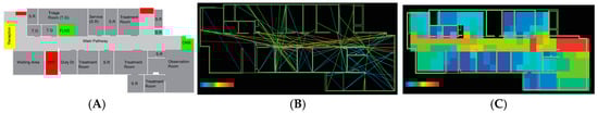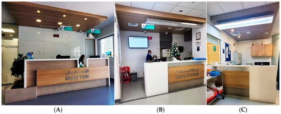 (A) Reception, (B) first-look nurse station (FLNS), and (C) observation nurse station (ONS) in case study “A”.