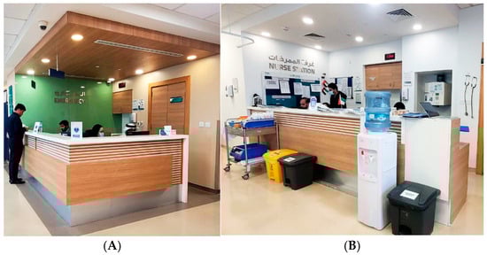 (A) Reception and (B) observation nurse station (ONS) in case study “B”.