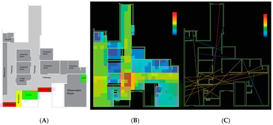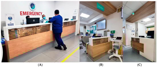 (A) Reception, (B) first-look nurse station (FLNS), and (C) observation nurse station (ONS) room in case study “C”.